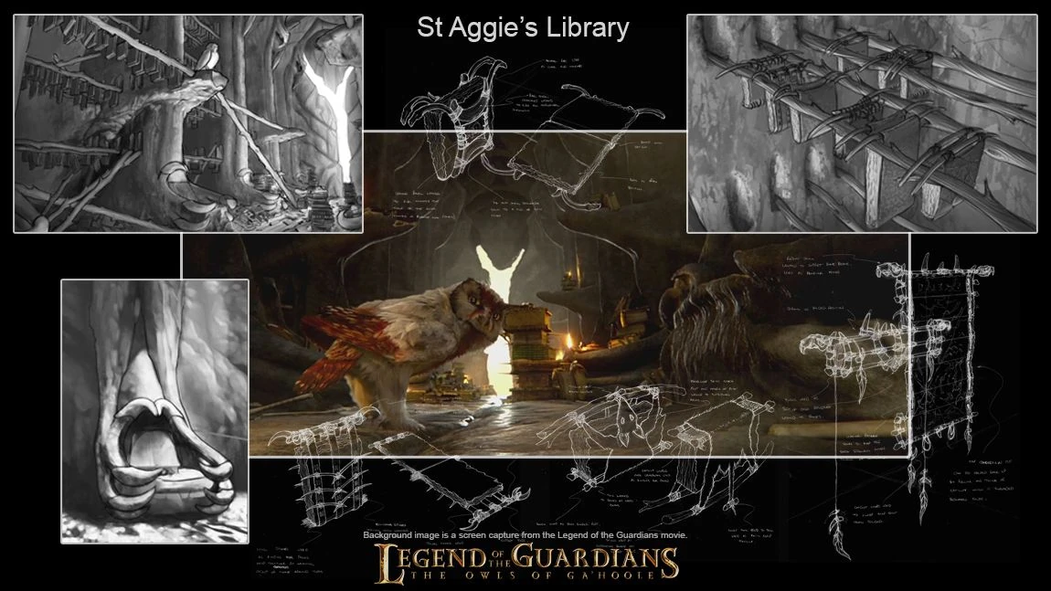 "St. Aegolius, or St. Aggies for short, was conceived as an ancient owl monastery that had been ransacked and repurposed by the Pure Ones into a Dickensian workhouse. It is hidden deep and a desert canyon, and for a brief sequence we see our kidnapped owlets being flown through a series of confusing tunnels in order to reach St. Aggies' entrance. Although the owls could probably find a more direct route to St. Aggies, we thought that the kidnappers would want the young owlets to be as disorientated and frightened as possible before they were indocrinated." - Grant Freckelton, The Art of Legend of the Guardians: The Owls of Ga'Hoole