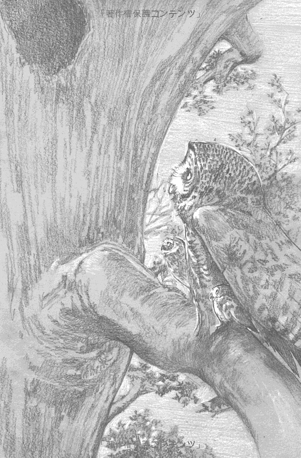 An illustration of Twilight, Digger, and Gylfie at the beginning of the book, huddling on the branch outside Ezylryb's hollow. From the Japanese version of the book.